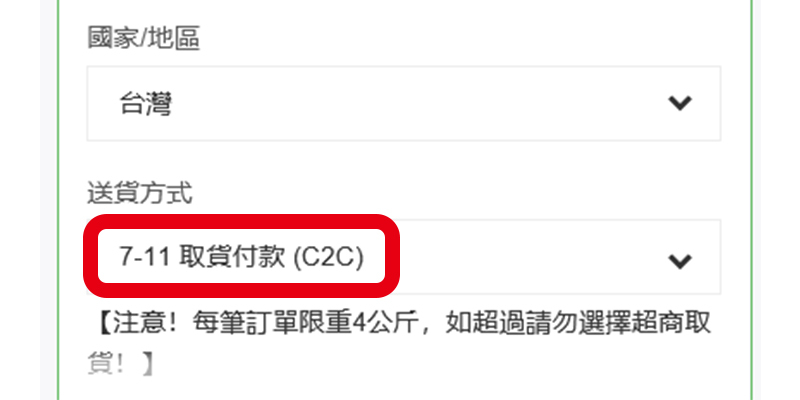 運送方式選擇「7-11取貨付款(C2C)」。